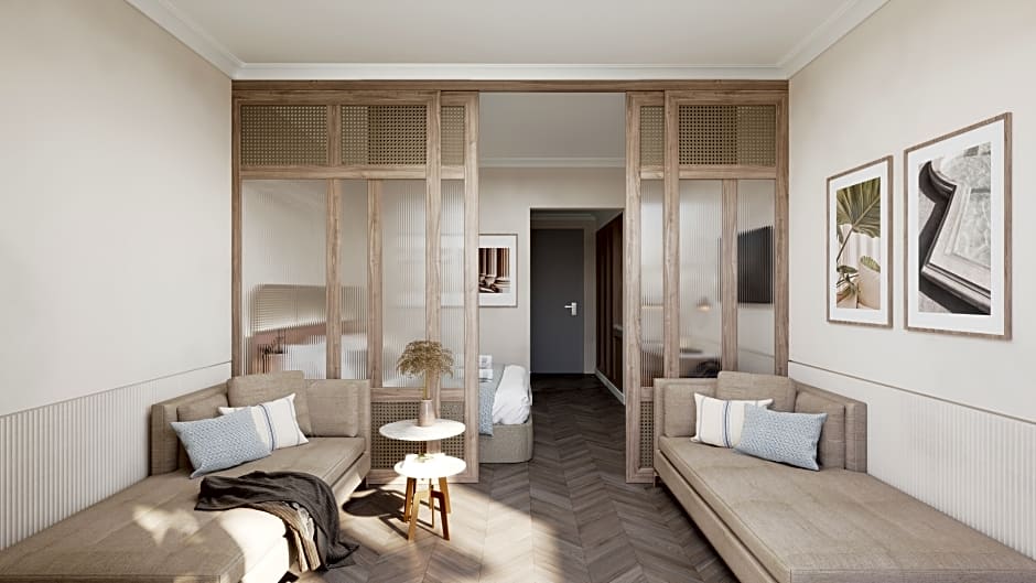 deluxe double inland view with partition & seating is 312 square feet and includes a king-size bed 150-183 width.